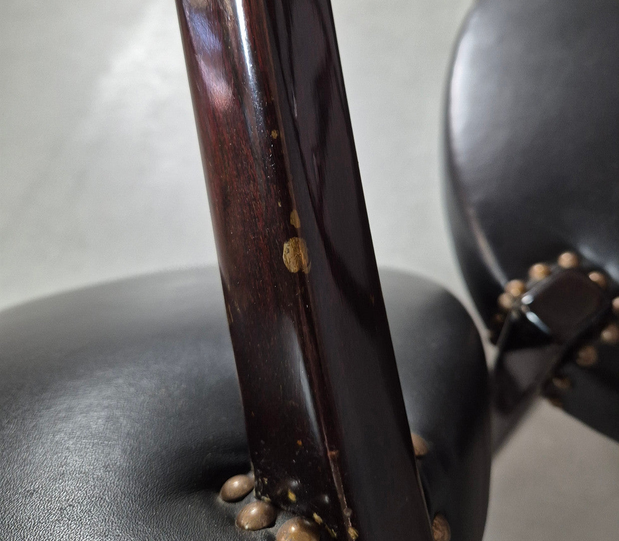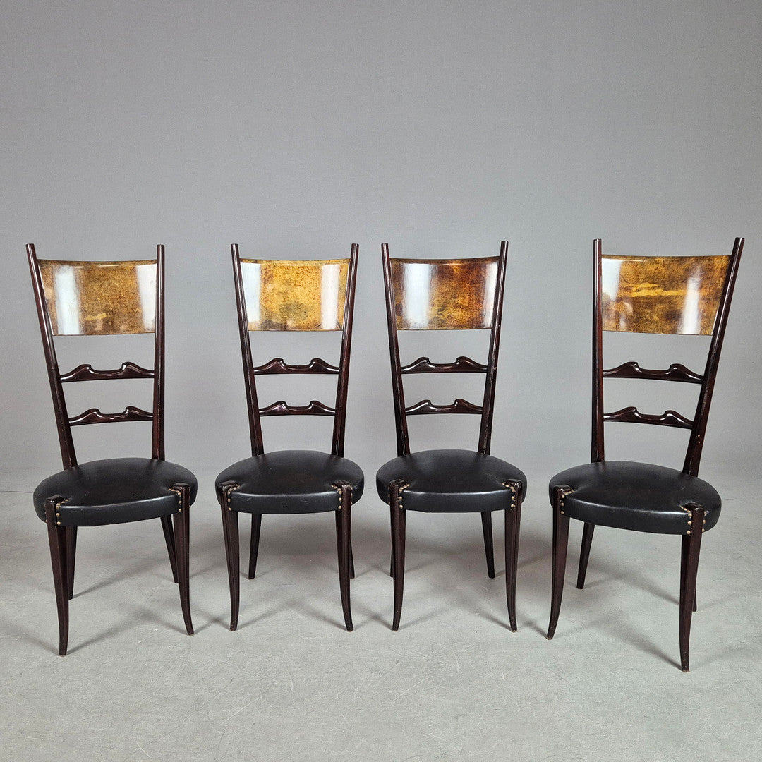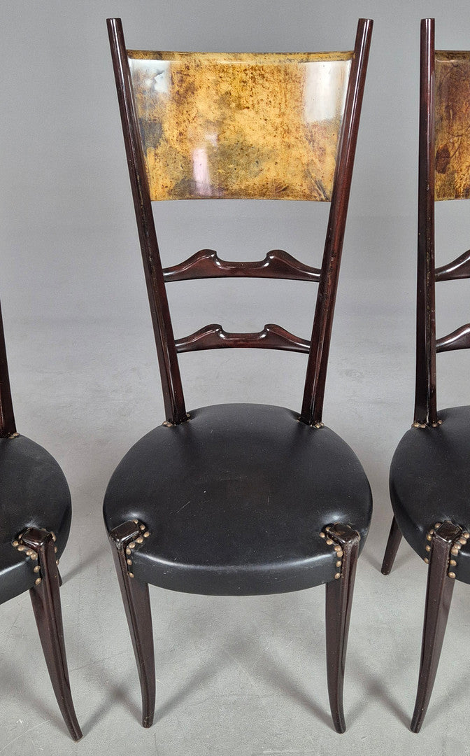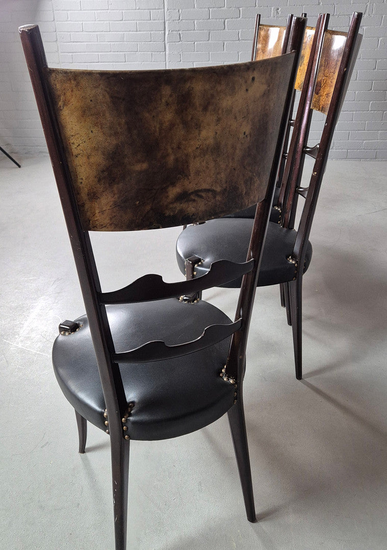 A sculptural set of four Aldo Tura-style dining chairs with lacquered goatskin-effect backs and elegant high silhouettes. Black faux leather studded seats and dark wood frames complete the vintage Italian look.