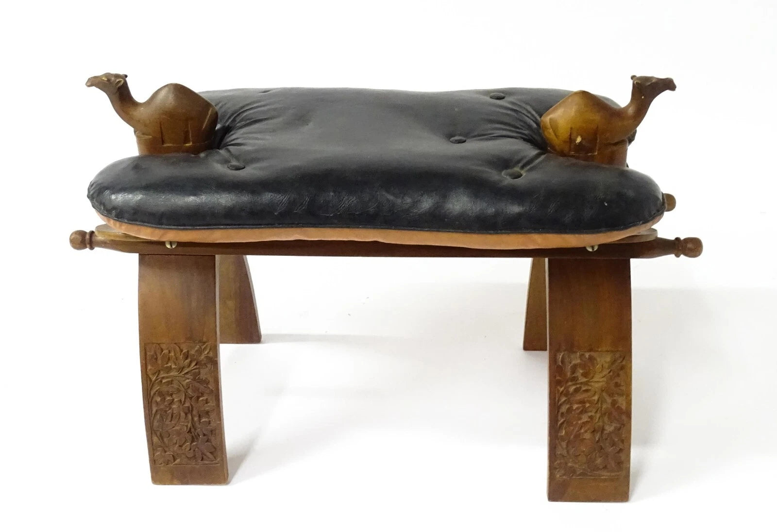Mid-Century Carved Wood Camel Saddle Stool w/ Upholstered Seat – 1950s–70s