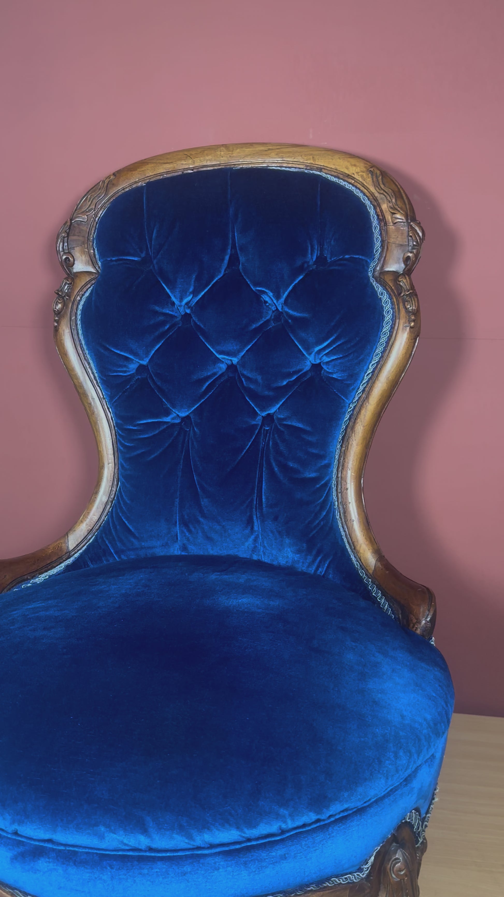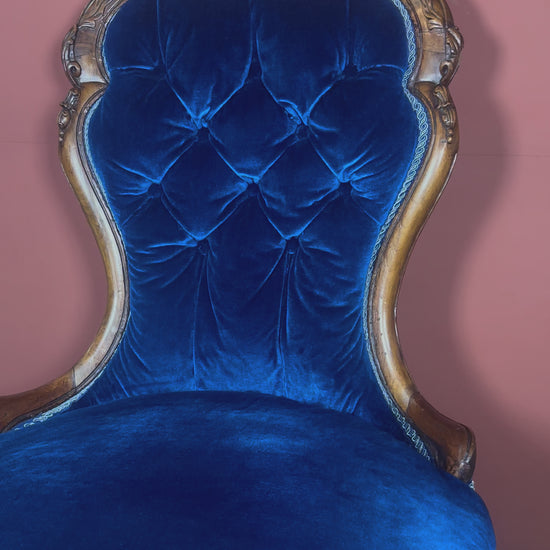 This beautiful Victorian spoonback nursing chair dates to around 1870 and features a carved solid walnut frame with its original curved silhouette. The chair has been sympathetically reupholstered in a plush blue velvet, adding a luxurious modern contrast to its antique frame.